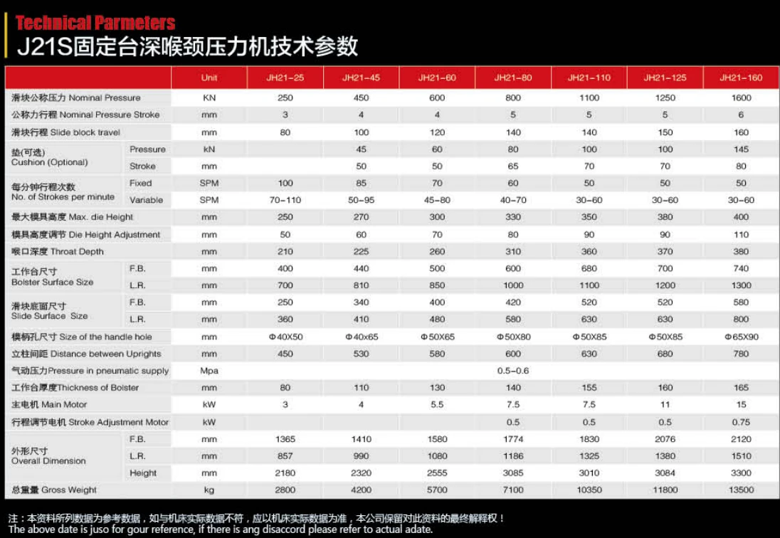 Features: Large throat depth (210-360mm), suitable for processing large plate edges or long workpieces; Nominal pressure 160-1000kN, slide stroke 60-140mm, strong stability and high stamping precision; Equipped with pneumatic assist device, safe and convenient operation.